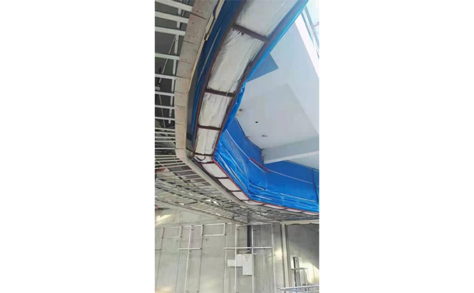 擋煙垂簾垂壁根據設計要求和現場實際情況采取如下施工順序:首先,搭設腳手架一放線一打眼--上脹栓一焊骨架。第二,吊件一安裝骨架…